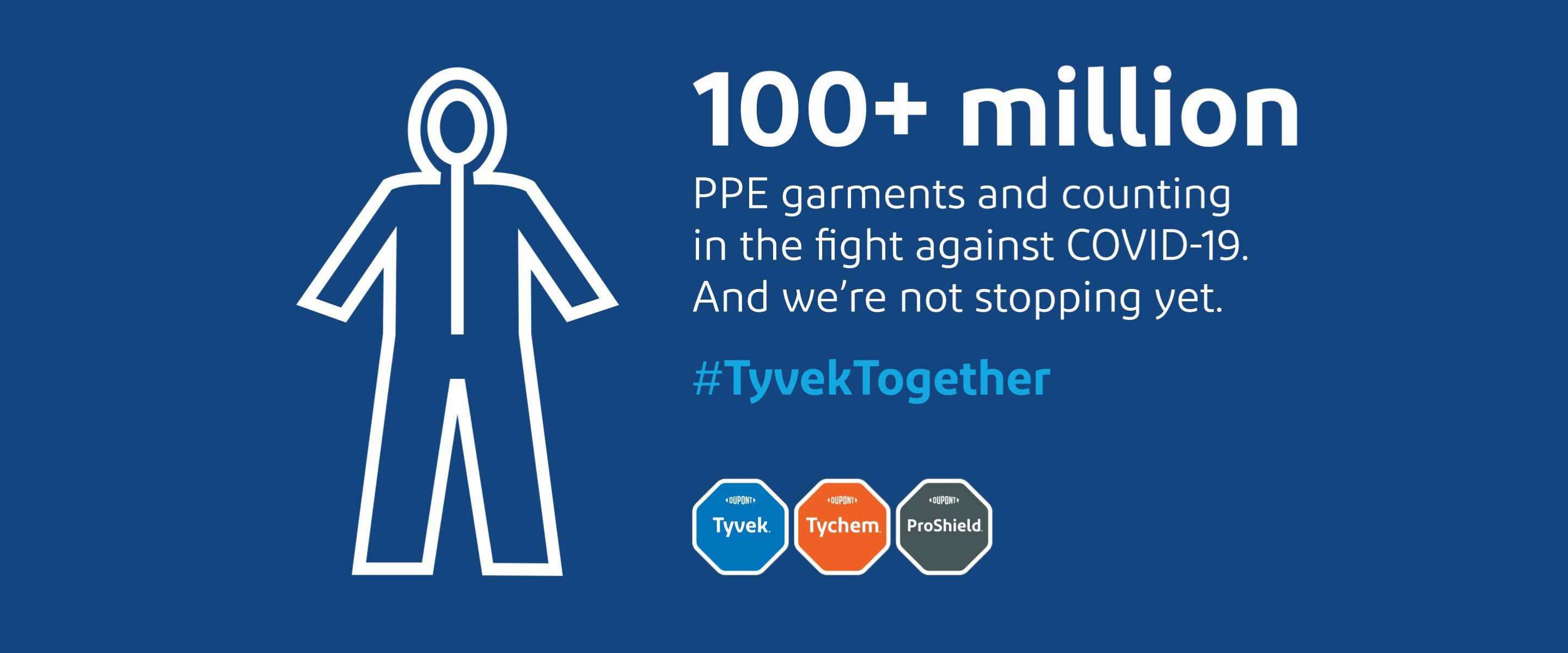 #TyvekTogether programı kapsamında, en ön cephede mücadele eden ekipler için ayda ek 6 milyon önlük üretimi artışı sağlamak üzere yeni özel bir Tyvek® kumaşı piyasaya sunduk. 2020’nin sonunda COVID-19 ile mücadele için ürettiğimiz Tyvek®, Tychem® ve ProShield® KKD tulumları sayısında 100 milyonu aştık ve daha fazlasını başarmak için çalışmaya devam ediyoruz.