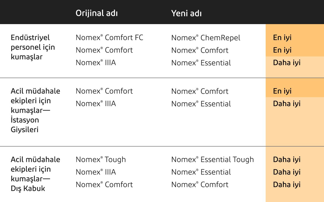 Bildiğiniz birçok ürünün adı değişiyor olsa da, bu Nomex® çözümlerinin özelliklerinin ve performansının aynı kalacağından emin olabilirsiniz. Özetle, global portföyümüzdeki ürün adlarını dünya genelinde tutarlı hale getirerek tüm bölgelerde daha kolay belirlenmelerini sağlıyor ve FR ve ark parlaması koruyucu çözümlerinde pazara yeni inovatif ürünler sunuyoruz.